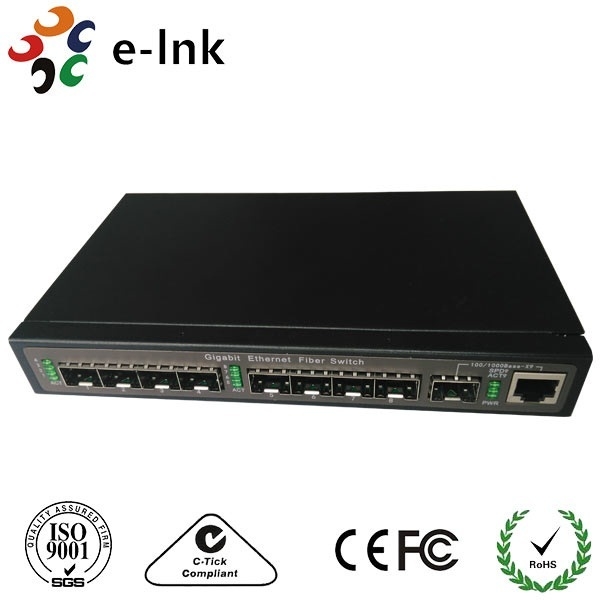 9 portas Switch de fibra não gerenciado: portas SFP 8x1000M + uplink da porta SFP 1x1000M (Combo) + uplink da porta RJ45 TP 1x10/100/1000M (Combo), slot SFP suporta 1000BASE-SFP, não inclui módulos SFP,Potência externa DC12V |